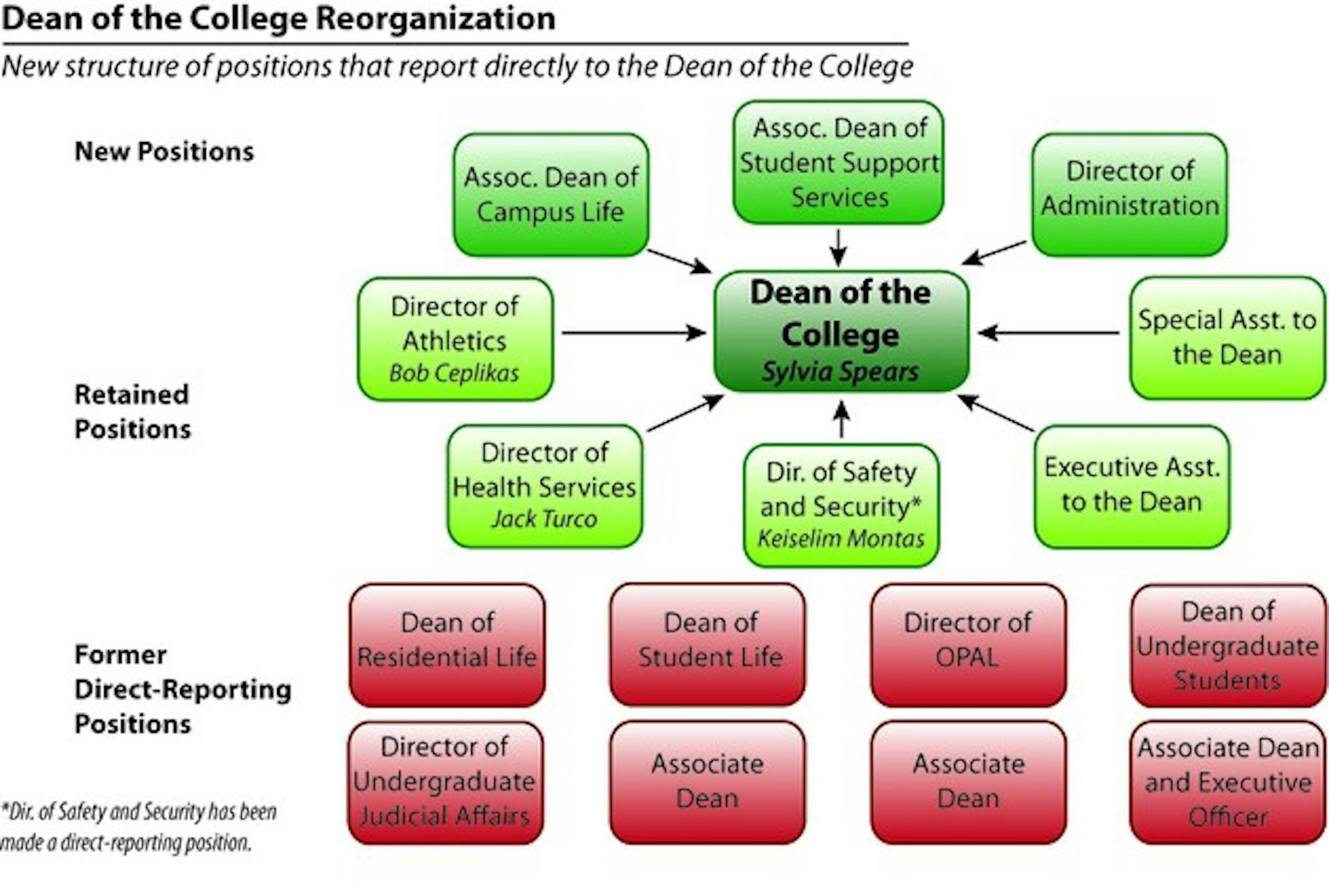 Of the eight positions that will directly report to the Dean of the College under the new structure, five currently exist director of athletics, director of health services, director of Safety and Security, executive assistant to the Dean of the College and special assistant to the Dean of the College. The director of Safety and Security currently does not directly report to the Dean of the College, but will under the new structure. The two assistants to the Dean of the College currently provide administrative support, but do not lead departments.