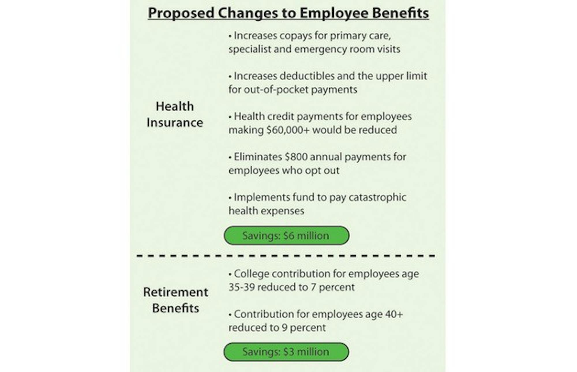The proposed changes would reduce the size of the health insurance credit given to employees who earn more than $60,000. Under the new plan, employees would pay between 2.85 percent and 45 percent of their health care plan costs.
