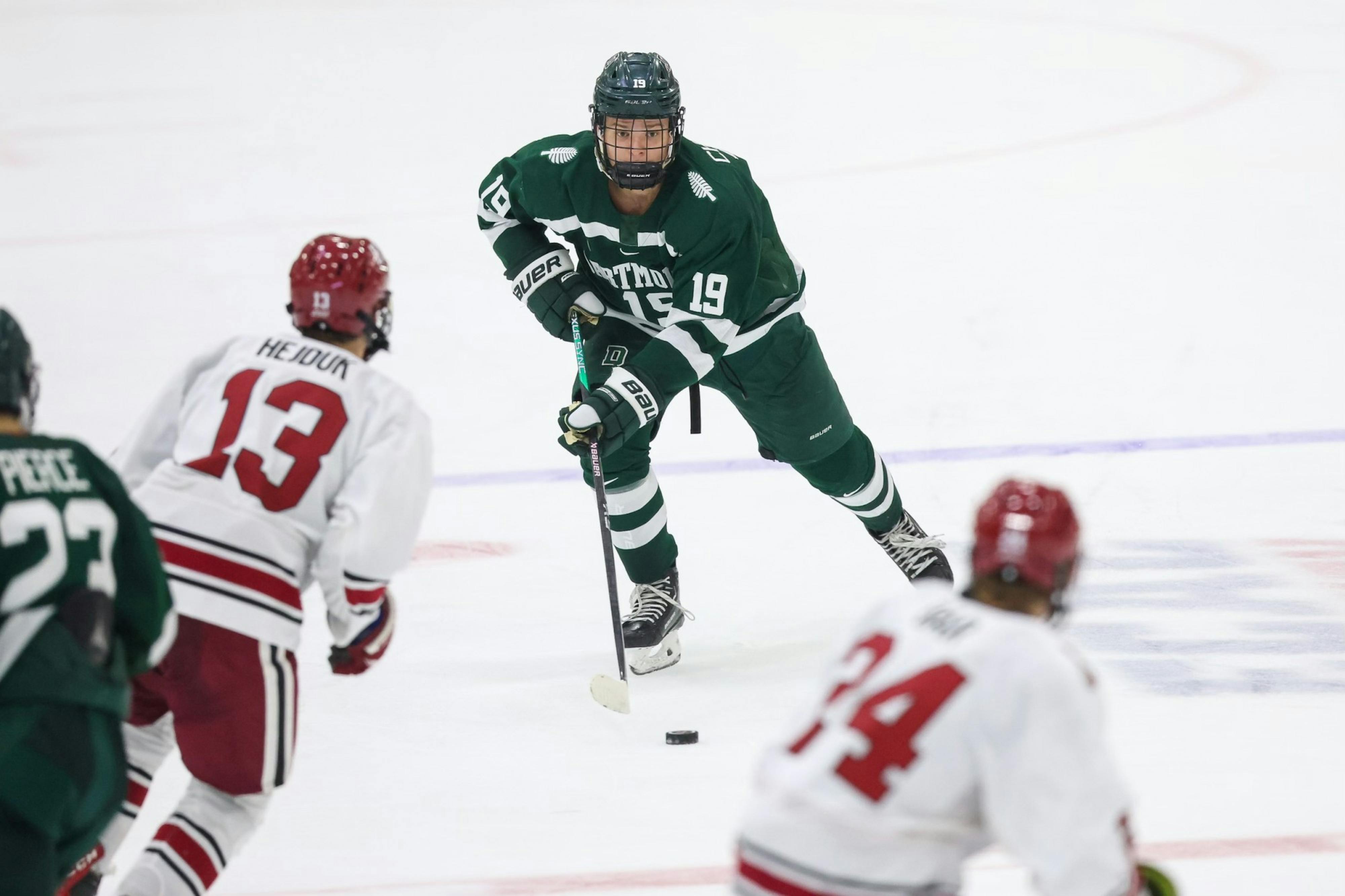 Brown found an early lead just seven minutes into the game following a minor tripping penalty against Tucker McRae ’26. The Big Green soon answered withSean Chisholm ’25 taking charge and passing to Cam MacDonald ’26, who tipped the puck into Brown’s goal, tying the game and scoring his first ever Dartmouth goal. Brown scored minutes into the second period, but Joey Musa ’24 secured another goal just a minute and a half later after a pass from Matt Hubbarde ’25 to tie the game once again.