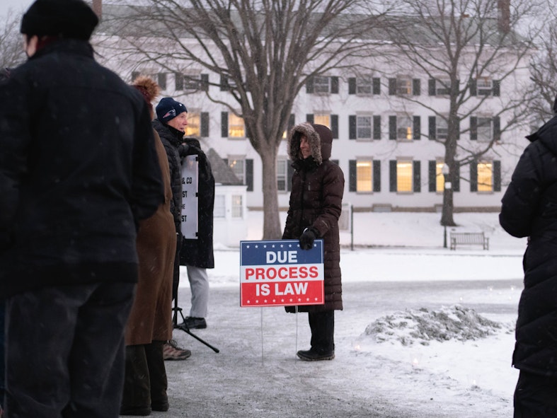 A member of the Upper Valley community holds a sign that reads "Due process is law."