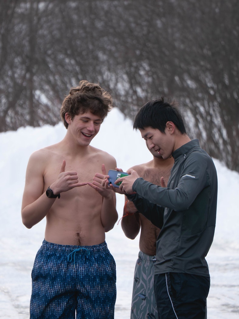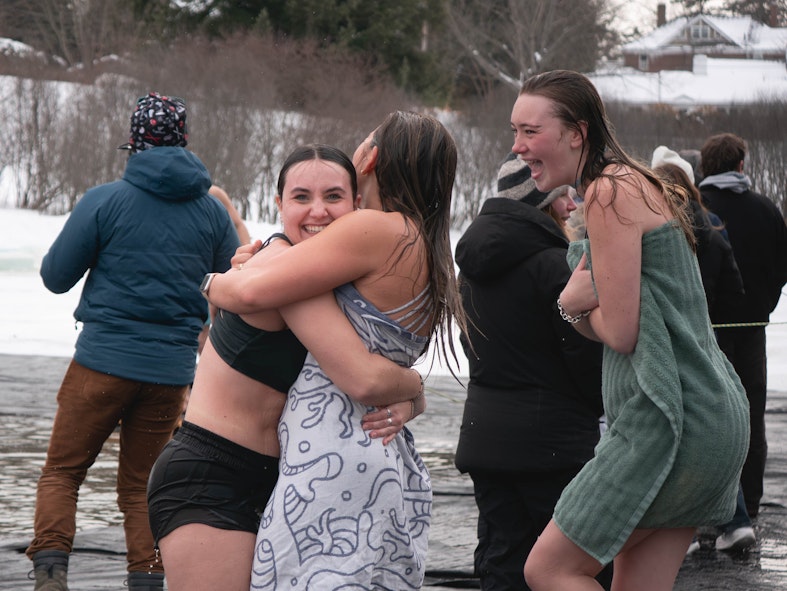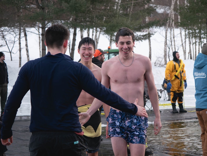 Mason Capone '27 embraces a friend after completing the Polar Bear Swim on Feb. 6.