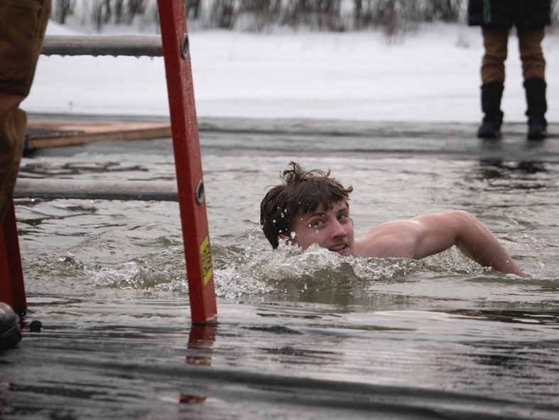 A student swims through the cold water of Occom Pond on Feb. 6.