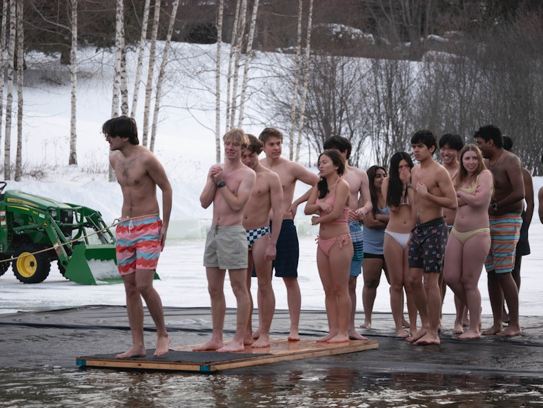 A line of students prepare to jump into Occom Pond as part of the Polar Bear Swim on Feb. 6.