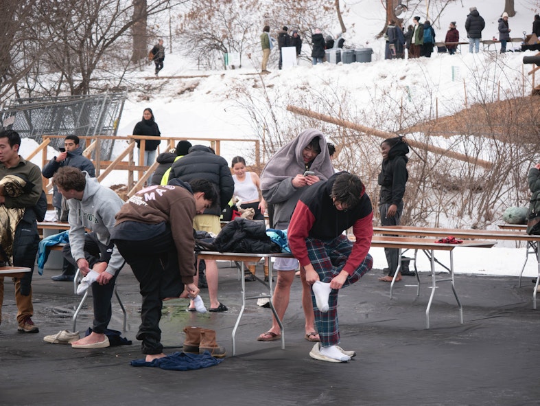 Students rush to put socks and shoes over their cold, damp feet following the Polar Bear Swim on Feb. 6.