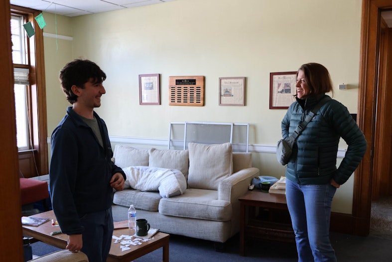 Alex Klee ’29 and Tiernan Sittenfeld ’96 speak in the offices of The Dartmouth following their interview on Feb. 4.