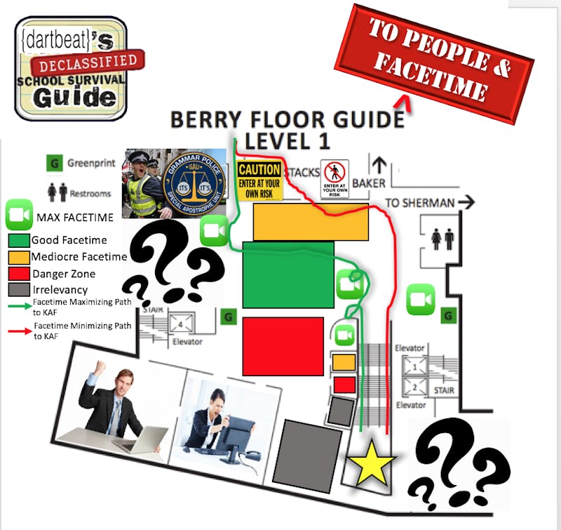 Everyone has their preferred study spots in the library, some more productive than others. However, Dartmouth students are often quick to label First Floor Berry as the most facetimey (and least productive) place in the library. However, this is not necessarily true! FFB is actually a very diverse ecosystem filled with a variation of facetimey-ness and productivity, ranging from the physics majors who scribble indiscernible thoughts on the walls of the group study rooms to the kids who “study” right outside of KAF, waving to every single person who passes by. For your convenience, we have taken the responsibility upon ourselves to educate the masses by mapping the real dynamics of FFB and beyond in “Dartbeat’s Declassified School Survival Guide.”