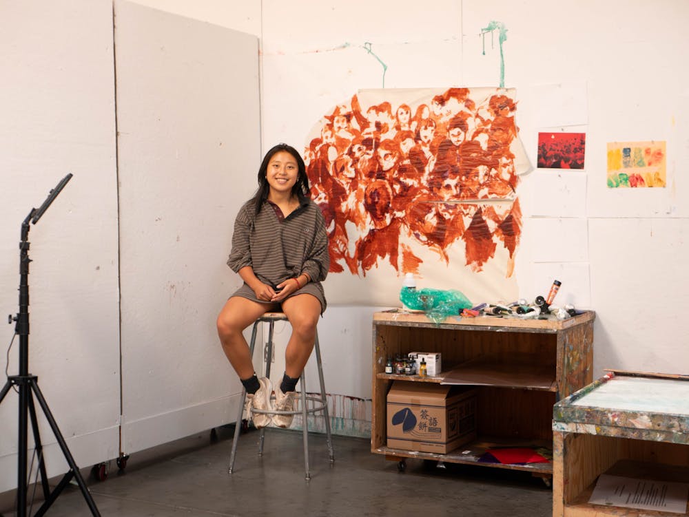 081925-dre-helencui-8.jpg Studio art and computer science double major Helen Cui ’27 sits in front of her painting inspired by the aesthetics of the Queer Intimism art movement and “film stills” on August 19 in the Black Visual Arts Center.