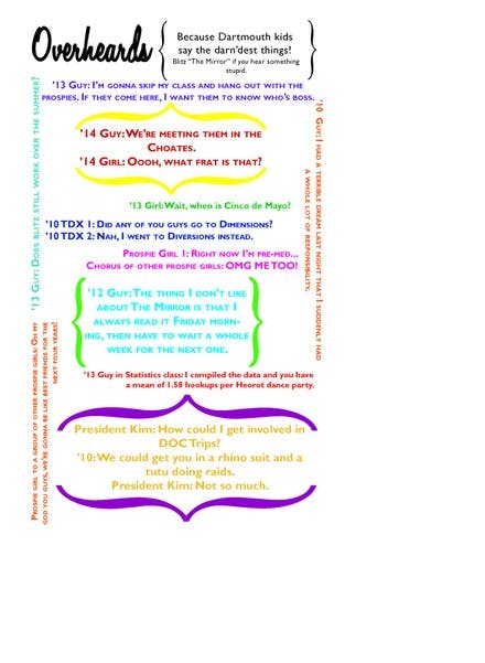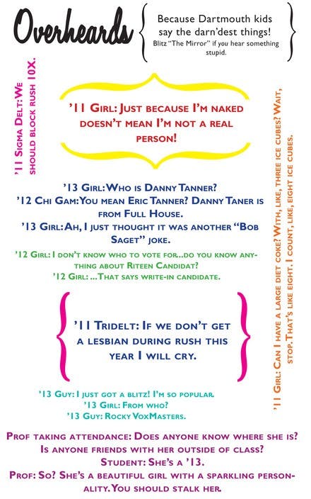 If you could institute one rule of etiquette at Dartmouth, what would it be? "Say goodbye to the rando you've been studying next to in the library for the past five hours when you leave." - Jean Luo '10 "The Male Specimen Washing Hands After Urination." - Sarah Frostenson '11 "Always flush, and bathroom freshener should be sprayed to your heart's desire." - Priya Shanmugam '13 "No snoring on 3FB!" - Jamila Ma '12 "Stop referring to New York City simply as The City'. We're not all from the Eastern Seabord, after all." - Noah Dentzel '10 "Take a hint from the Southerners and say hello to everyone, it makes the world less awkward." - Jen Argote '10 "Show freshman boys some love.