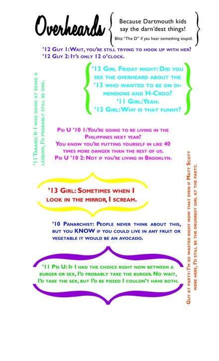 '12 Guy 1: Wait, you're still trying to hook up with her?'12 Guy 2: It's only 12 o'clock. '13 Girl Friday night: Did you see the overheard about the '13 who wanted to be on dimensions and H-Croo?'11 Girl: Yeah.'13 Girl: Why is that funny? '11 Tabard: If I was good at being a lesbian, I'd probably still be one. Psi U '10 1: You're going to be living in the Philippines next year?You know you're putting yourself in like 40 times more danger than the rest of us.Psi U '10 2: Not if you're living in Brooklyn. Guy at party: I'm so wasted right now that even if Matt Scott were here, I'd still be the drunkest girl at the party. '13 Girl: Sometimes when I look in the mirror, I scream. '10 Panarchist: People never think about this, but you KNOW if you could live in any fruit or vegetable it would be an avocado. '11 Psi U: If I had the choice right now between a burger or sex, I'd probably take the burger.